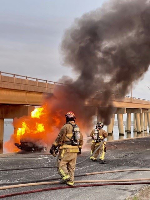 Town of Southampton, NY May 5, 2025 — The Hampton Bays Fire Department successfully responded to and extinguished a vehicle fire on the South side of Ponquogue Bridge Sunday morning testing their temporary Ponquogue Bridge response plans.